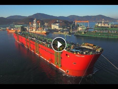 Prelude FLNG is the world's first floating liquefied natural gas platform as well as the largest offshore facility ever constructed. The Prelude is being built by Samsung Heavy Industries and Technip in South Korea for Royal Dutch Shell. She is 488 metres (1,601 ft) long, 74 metres (243 ft) wide, and made with more than 260,000 tonnes of steel. At full load, she will displace more than 600,000 tonnes; more than five times the displacement of a Nimitz-class aircraft carrier.
